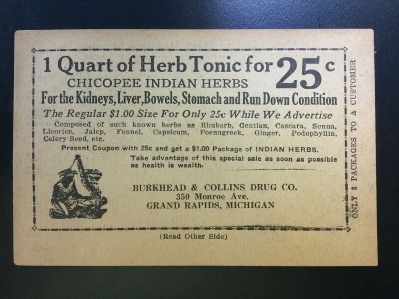 Title (ebay affiliate link): Old Advertising Quack Medicine Card CHICOPEE INDIAN HERBS TONIC DRUG CO MICHIGAN