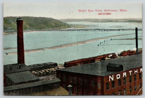 Title (ebay affiliate link): Stillwater MN Northwestern Building~Piles of Lumber~Shore of St Croix River 1914