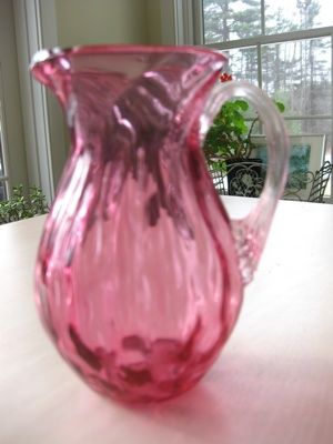 VTG CRANBERRY GLASS APPLIED CLEAR HANDLE MILK PITCHER