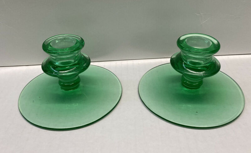 Title (ebay affiliate link): Vintage Pair Green Depression Uranium Glass Short Pedestal Candle Stick Holders