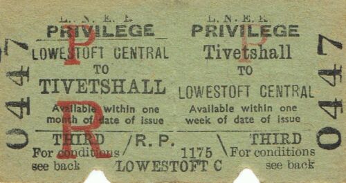 Title (ebay affiliate link): Railway ticket LNER Tivetshall to Lowestoft-Central third class return undated