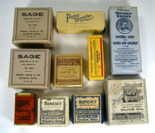 Title (ebay affiliate link): 10 asst old PHARMACEUTICAL bottles, boxes, tin HERBS CAPSULES DIURETIC TABLETS