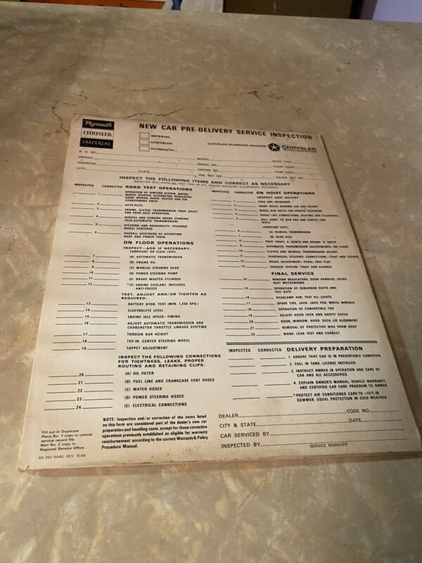 Vtg Mopar Chrysler Plymouth Dealer New Car Pre Delivery Service Inspection Lot