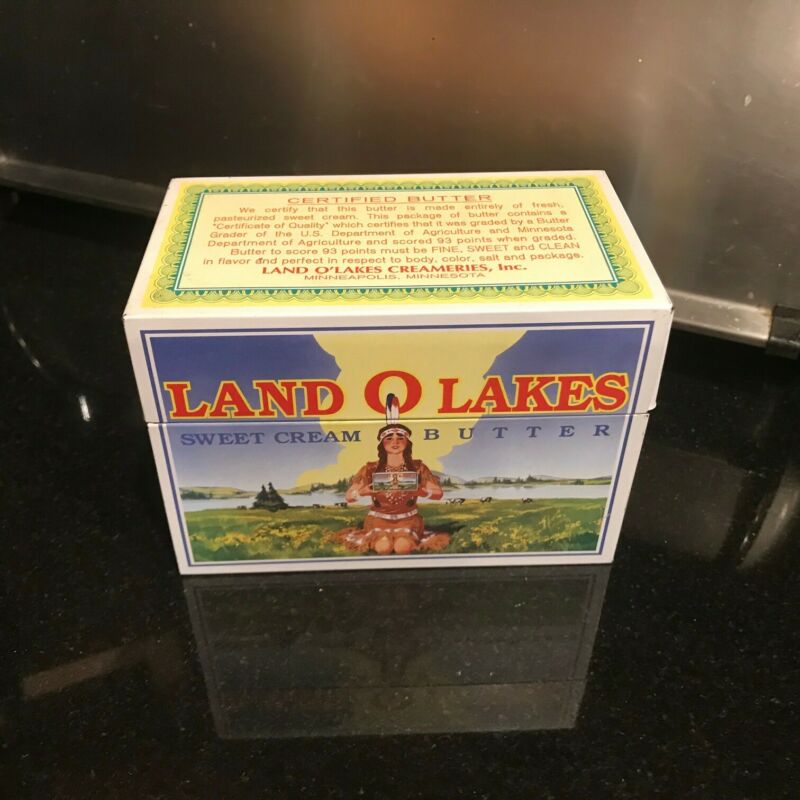 Title (ebay affiliate link): Vtg Land O Lakes Native American Maiden Sweet Cream Butter Metal Tin Recipe Box