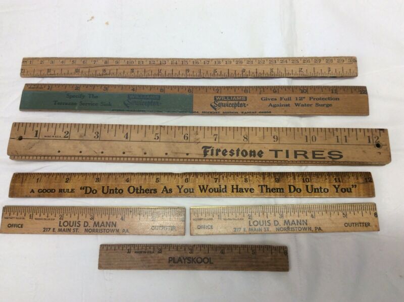 Title (ebay affiliate link): 7 Vintage Advertising Wooden Rulers Coca Cola Firestone Playskool Williams Servi
