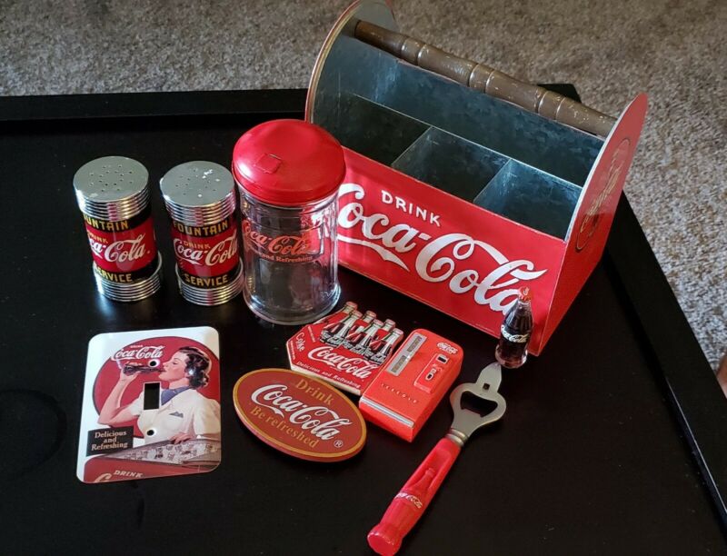 Title (ebay affiliate link): Coca-Cola Lot S&P, Sugar, Fridge magnets, Can Opener, Light switch cover