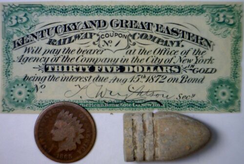 Title (ebay affiliate link): 1860s CONFEDERATE Era $35 RAILROAD Intrst Note+Civil War BULLET+1865 1 CENT Coin