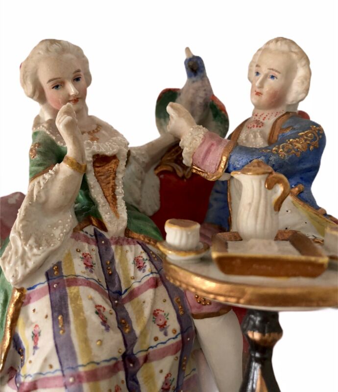 Vintage Bisque Porcelain Colonial Victorian Couple Figurine w/ Parrot Gilt Trim