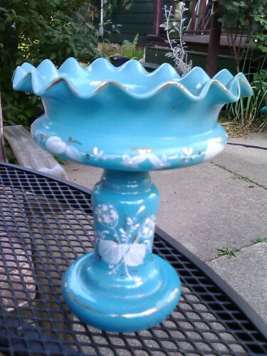 Antique Victorian Blue Opaline Footed ruffled vase w/ HP White Flowers