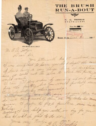 US 1909 Brush Run-A-Bout Car Stationery Signed by F.A. Trinkle See Description