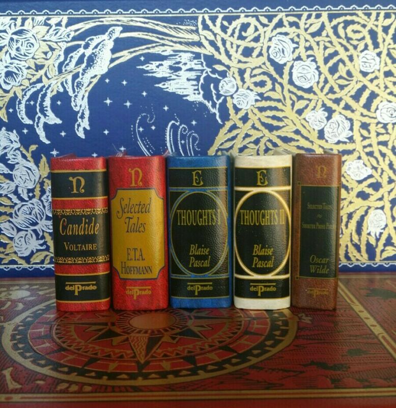 Title (ebay affiliate link): 5 Del Prado Miniature Books Candide Voltaire Oscar Wilde Hoffman Tales Thoughts.