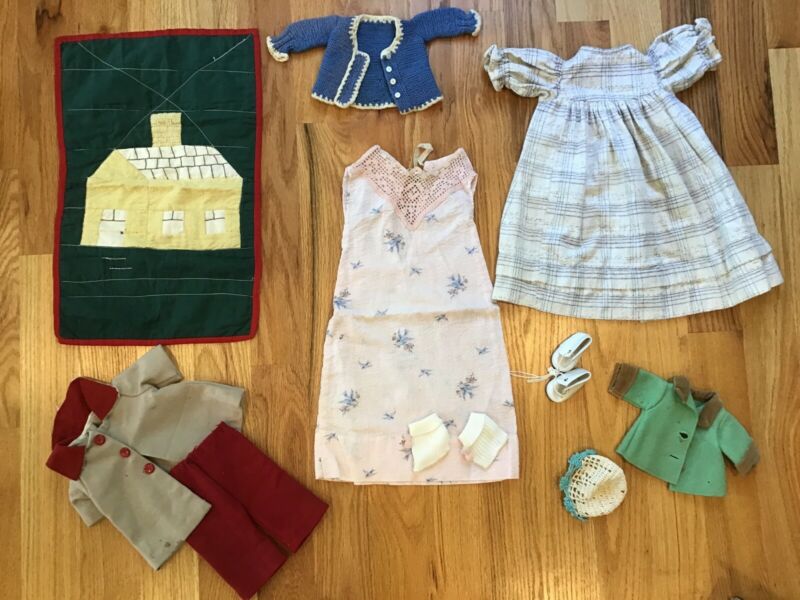 Title (ebay affiliate link): Lot Of Antique/Vintage Clothes for Dolls Plus Handmade Doll Crib Quilt