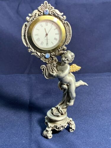 SMALL VINTAGE METAL DECORATIVE CHERUB STATUE TABLE CLOCK