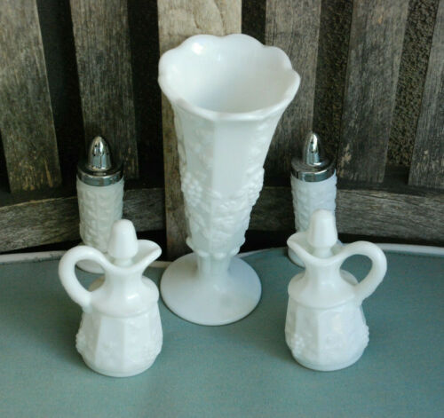 Title (ebay affiliate link): Vintage 5 Piece Set Westmoreland Milk Glass Paneled Grape Pattern Never Used