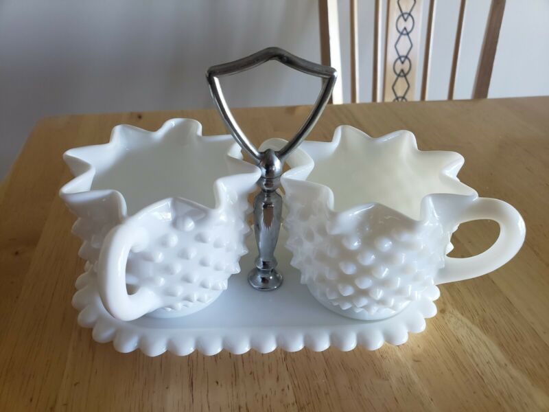 Title (ebay affiliate link): Vintage Crimped Hobnail White Milk Glass Cream Pitcher and Sugar Bowl & holder