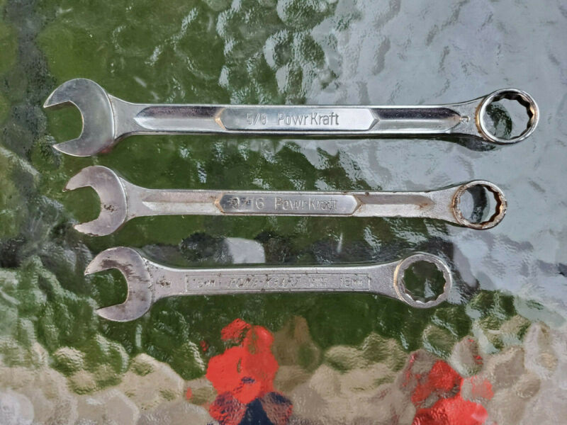 Title (ebay affiliate link): Montgomery Ward Powr-Kraft Mixed Combination Wrenches Standard & Metric USA Made