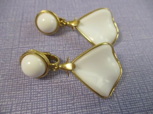 Title (ebay affiliate link): Signed TRIFARI White Milk GLASS Molded Dangle Goldtone Vintage Clip EARRINGS