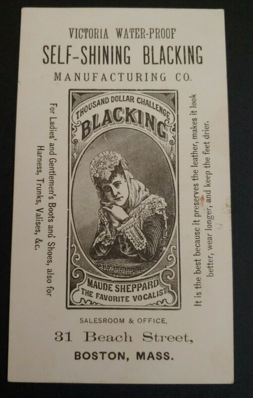 Title (ebay affiliate link): Trade Card VICTORIA WATER PROOF SELF-SHING BLACKING, BOSTON MA - MAUDE SHEPPARD