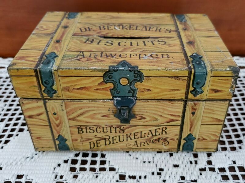 Antique De Beukelaer Biscuit Tin Advertising Trunk Bank