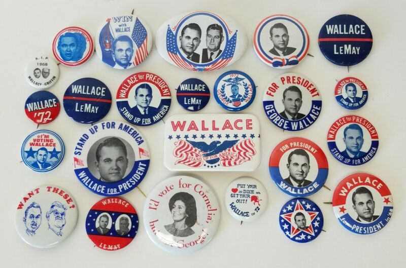 Title (ebay affiliate link): 24 Vintage 1968 & 1972 George Wallace Presidential Campaign Pinback Buttons