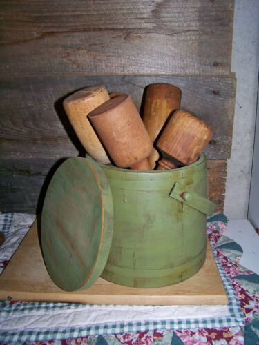 Title (ebay affiliate link): Primitive Painted Med Firkin Wood Sugar Bucket Metal Bands Swing Handle
