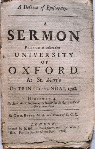 Title (ebay affiliate link): 1708 Thomas Bisse - Defense of Episcopacy - Doctrinal Sermon on Hebrews 5:4