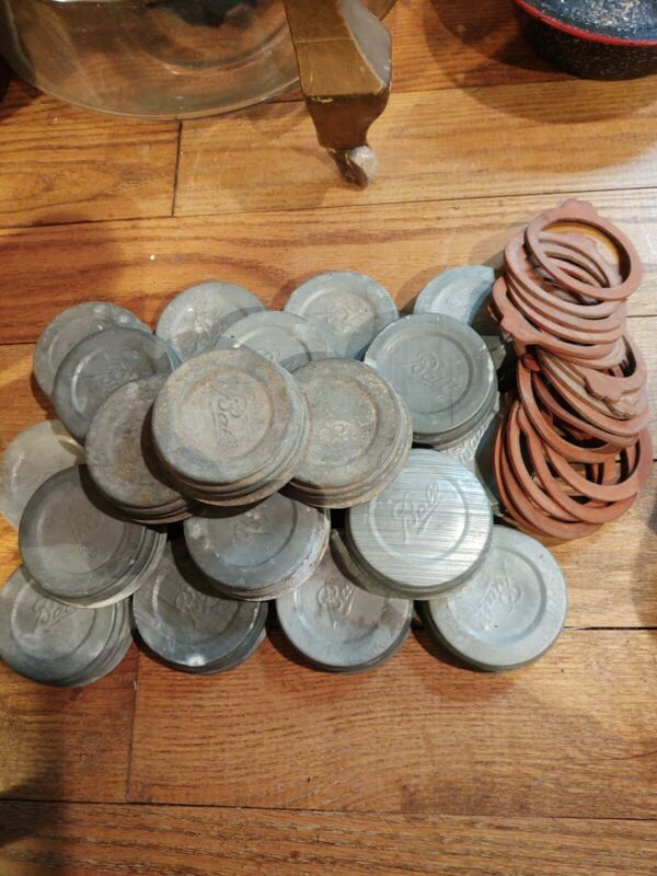 Title (ebay affiliate link): 24 VTG ZINC CANNING JAR LID + MILK GLASS INSERTS Ball + rubber rings