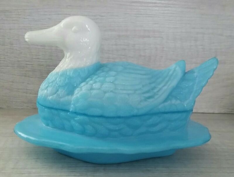 Title (ebay affiliate link): Vintage Milk Glass Duck Blue White Candy Dish Trinket Dish