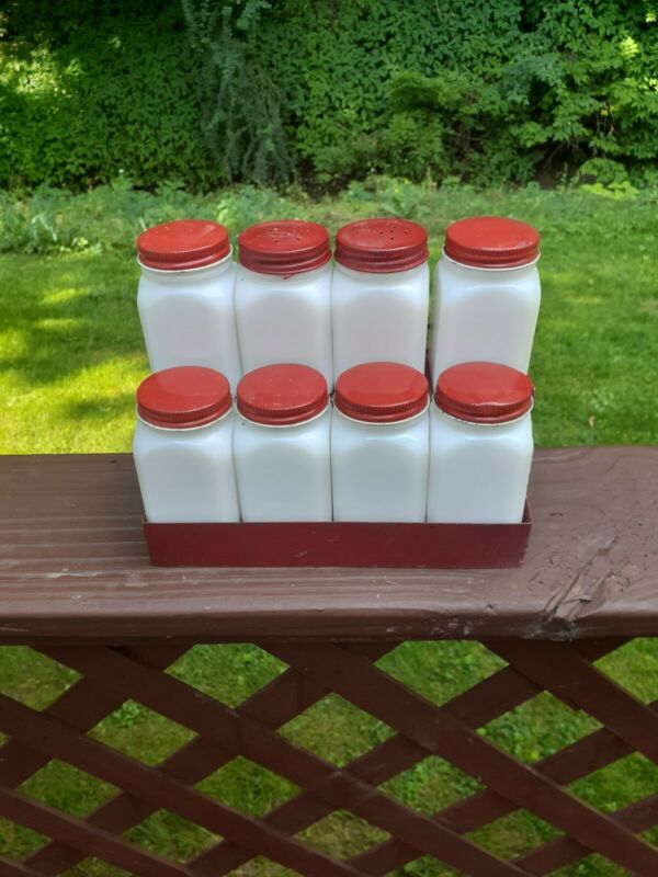 Vintage Milk Glass Spice Jar set With Red Metal tops and Rack