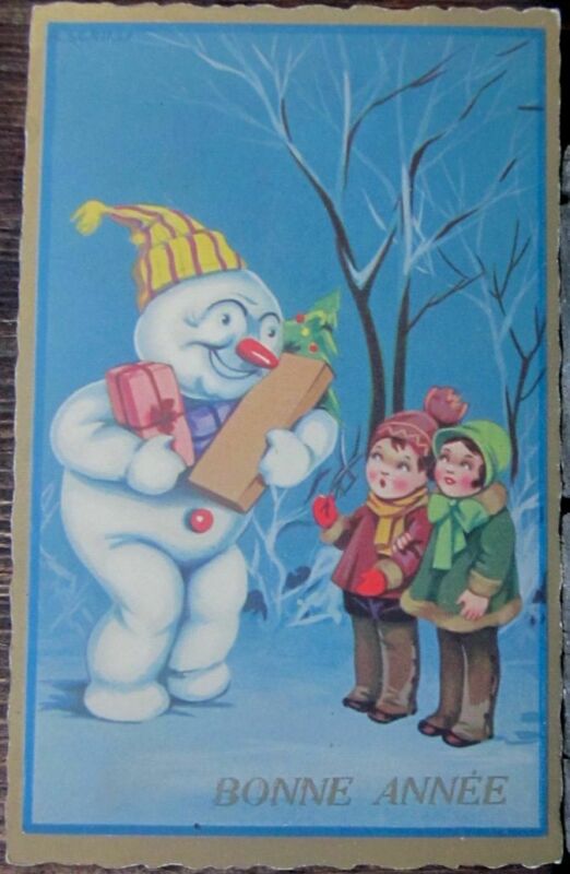 Title (ebay affiliate link): BONNE ANNEE SNOWMAN WITH GIFTS FOR TWO CHILDREN HAPPY NEW YEAR