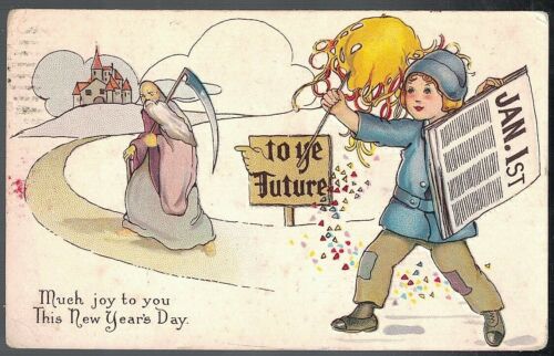 Title (ebay affiliate link): ANTIQUE 1915 MUCH JOY TO YOU THIS NEW YEAR''S DAY YOUNG BOY NEWSPAPER POSTCARD