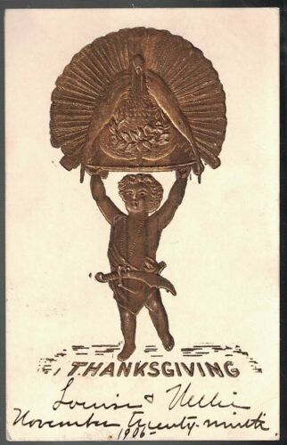 ANTIQUE 1906 THANKSGIVING BOY HOLDS UP GOLDEN TURKEY EMBOSSED HOLIDAY POSTCARD