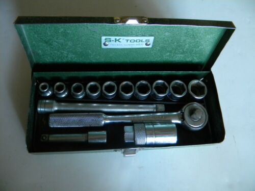 Title (ebay affiliate link): Vintage S-K 3/8 Metric Socket Set -- Extensions & Ratchet 14 Pieces w/ Box