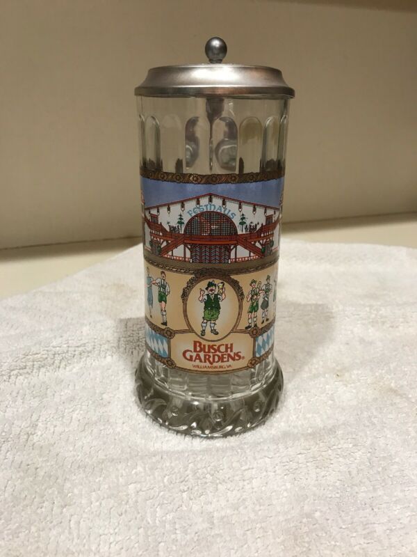 Zinn Pewter BUSCH GARDENS WILLIAMSBURG VA Beer Stein Glass with pewter Lid Art