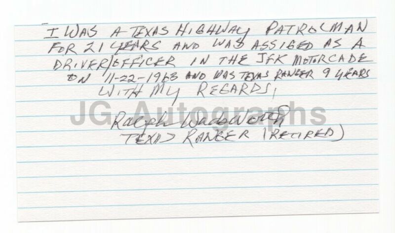 Title (ebay affiliate link): Ralph Wadsworth - Texas Ranger Driver JFK Assassination Motorcade - Signed Card