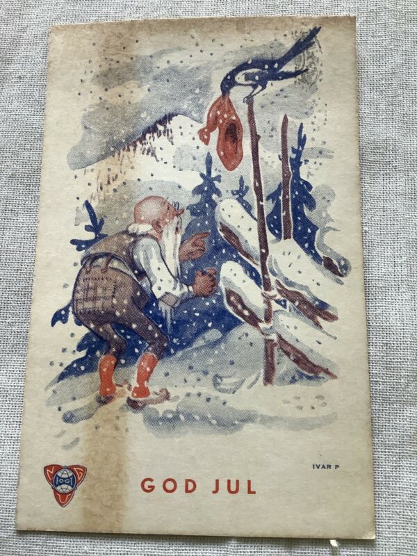 Title (ebay affiliate link): Vintage Swedish Christmas Postcard Old Man Bird Raven Hat God Jul Damaged/stain