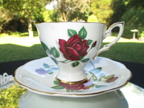 Title (ebay affiliate link): CUP SAUCER ROYAL STANDARD CORSET FOOTED PURE ELEGANCE RED VELVET LONG STEM ROSE