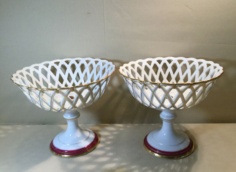 Antique Pair Vieux Old Paris RETICULATED Compotes Large Plum Gilt White