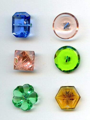 6 VINTAGE DEPRESSION GLASS buttons--DIFFERENT COLORS--5 SHAPES--3/4"