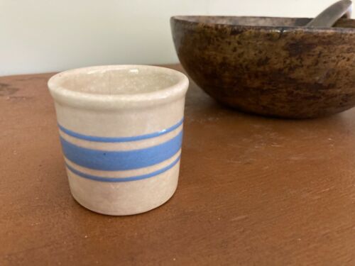 VINTAGE BLUE STRIPED STONEWARE PRIMITIVE CUSTARD CUP MINI CROCK FARMHOUSE 2.5"