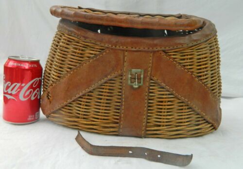 Antique Wicker & Leather Fish Creel Basket w Ruler GREAT CABIN DECOR PIECE