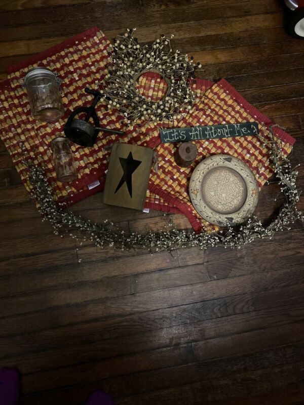 Title (ebay affiliate link): Lot of Primitive Country Farmhouse Home Decor: Jars ,Press, Timed Candle ,Box