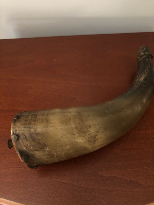 Antique Black Powder Horn With Wood Cap 8"