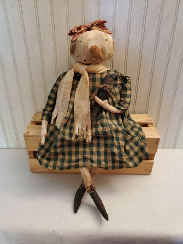 Primitive Grungy Grubby Sally Snow Lady Snowman Christmas Doll & Her Crow