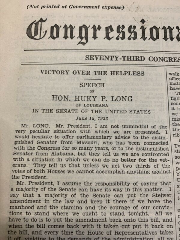 Title (ebay affiliate link): 1933 US SENATOR HUEY P LONG Speech - Victory Over The Helpless Congressional Rec