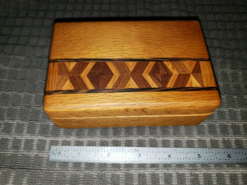 Handmade, Signed Wooden Marquetry Inlaid Wood Folk Art Trinket Jewelry Box