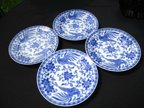 4 PHOENIX BIRD OLD NORITAKE TEA PLATES JAPAN BLUE ON WHITE PORCELAIN 5.5"