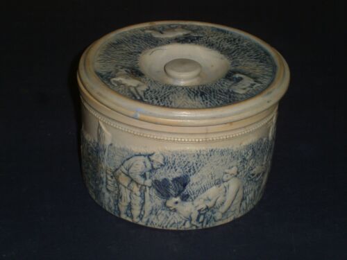 Antique Whites Utica 2 pound Butter Stoneware Crock lid Embossed Hunt/Stag Scene