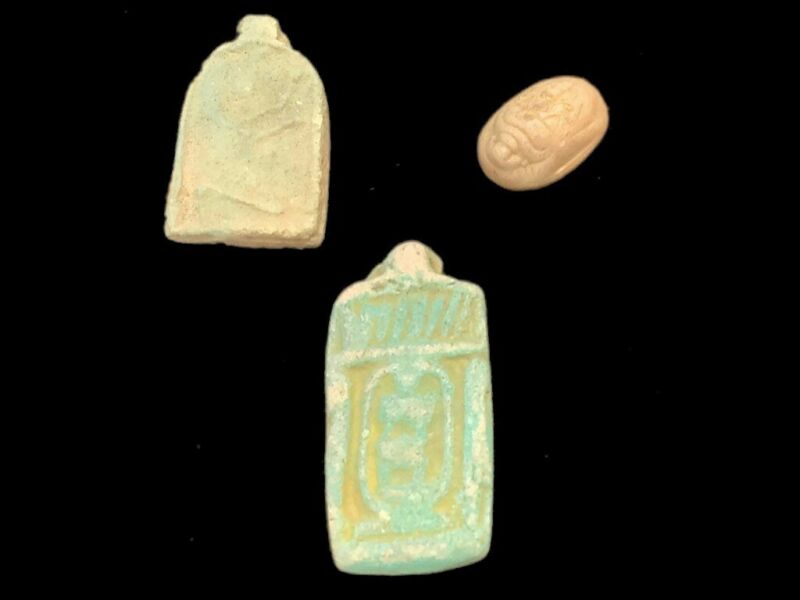 Title (ebay affiliate link): BEAUTIFUL EGYPTIAN AMULET GROUP WITH KNEELING PHARAOH AND SCARAB 300 BC (3)