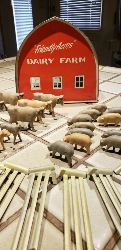 Title (ebay affiliate link): Vintage Suzy Goose Friendly Acres Dairy Farm tin play set.